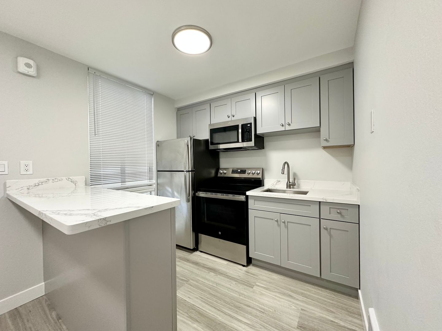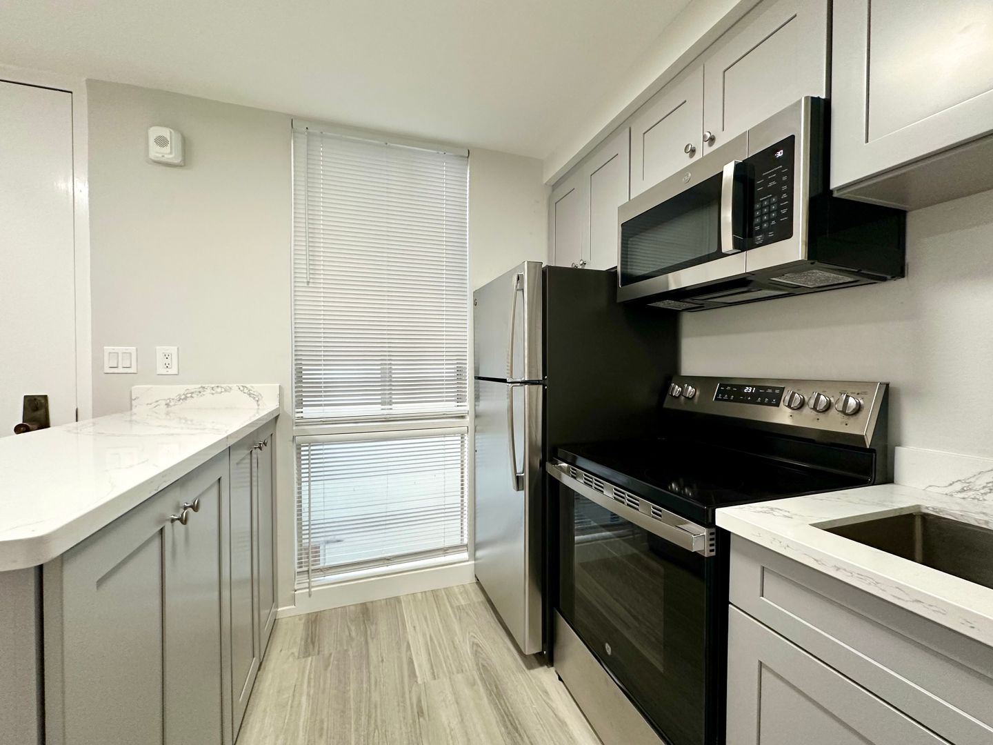 -Updated kitchen with electric stove, refrigerator and microwave