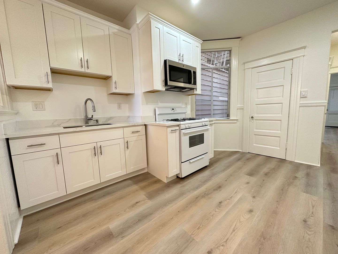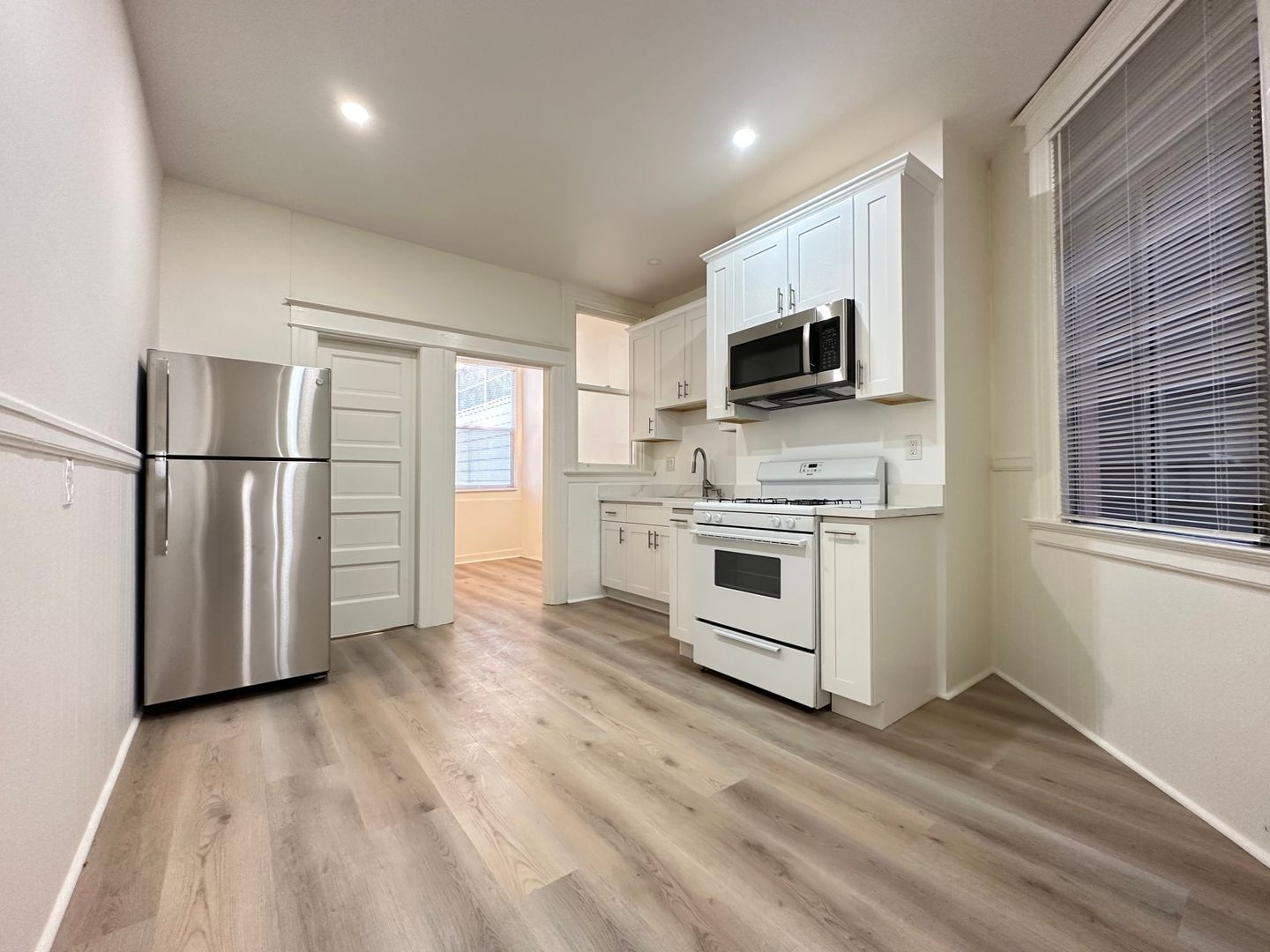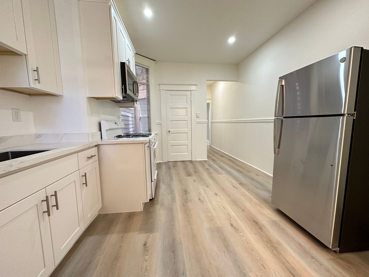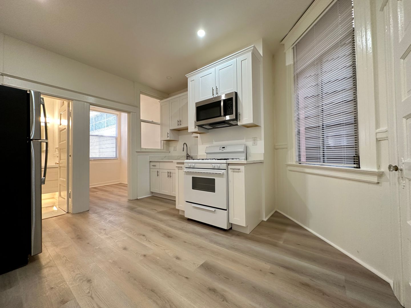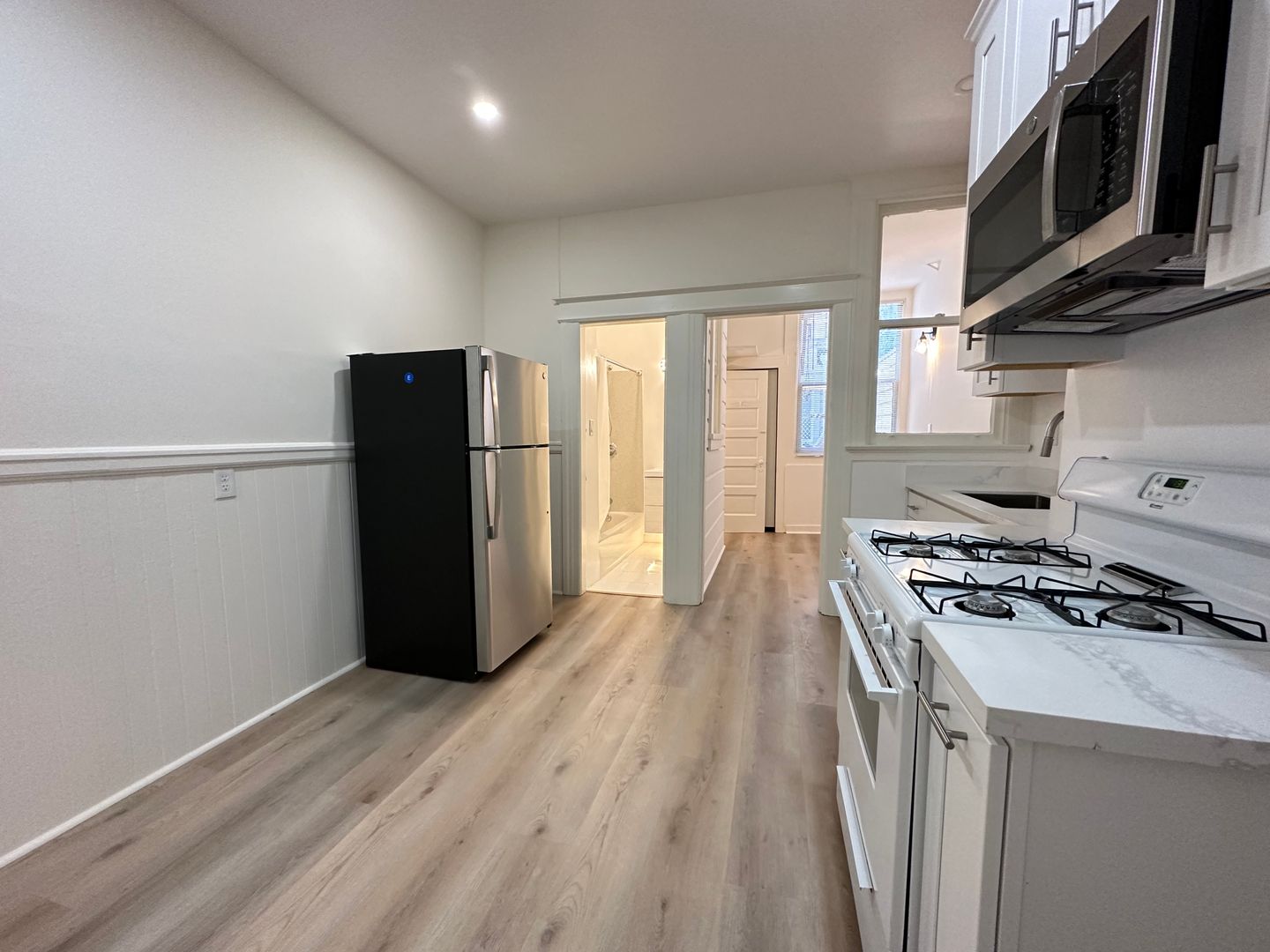 -Updated kitchen with gas range, oven, refrigerator, and new countertops