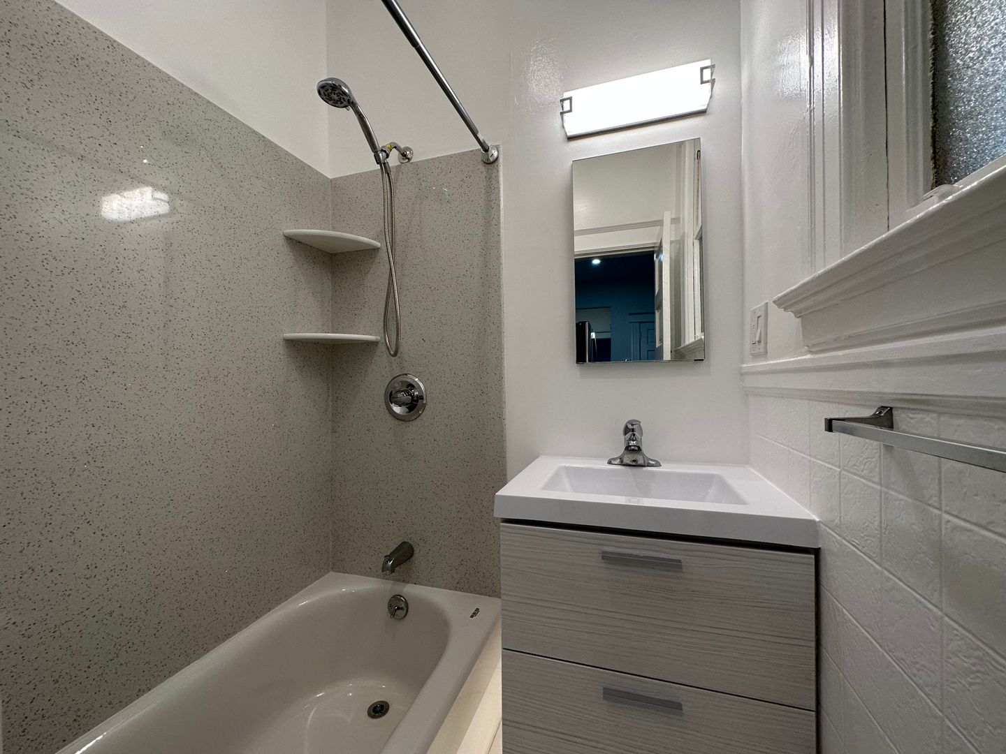 -Renovated bathroom with shower over tub and large vanity